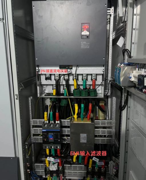 電機(jī)額定電流為290A,電機(jī)轉(zhuǎn)速1485轉(zhuǎn),額定功率160kw配電房和皮帶機(jī)電機(jī)之間的線纜超過150m。根據(jù)電機(jī)的型號(hào),我司選擇了額定電流370A的200KW變頻器。為了抑制電網(wǎng)中的高次諧波,防止變頻器被干擾,我司在變頻器輸入端加裝EMI輸入濾波器,不僅能起到補(bǔ)償作用,還可以提高整套設(shè)備的功率因數(shù)(節(jié)能)為了減少輸出電纜上和電機(jī)中的脈沖電流,延長(zhǎng)電機(jī)壽命,在變頻器與電機(jī)之間使用更長(zhǎng)的電纜連線,所以我司選擇在變頻器母線加裝直流電抗器(降低母線紋波系數(shù),減少電流脈動(dòng)值),變頻器和電機(jī)之間加裝輸出電抗器,這兩者均可提升整套系統(tǒng)的功率因數(shù)(節(jié)能)。
